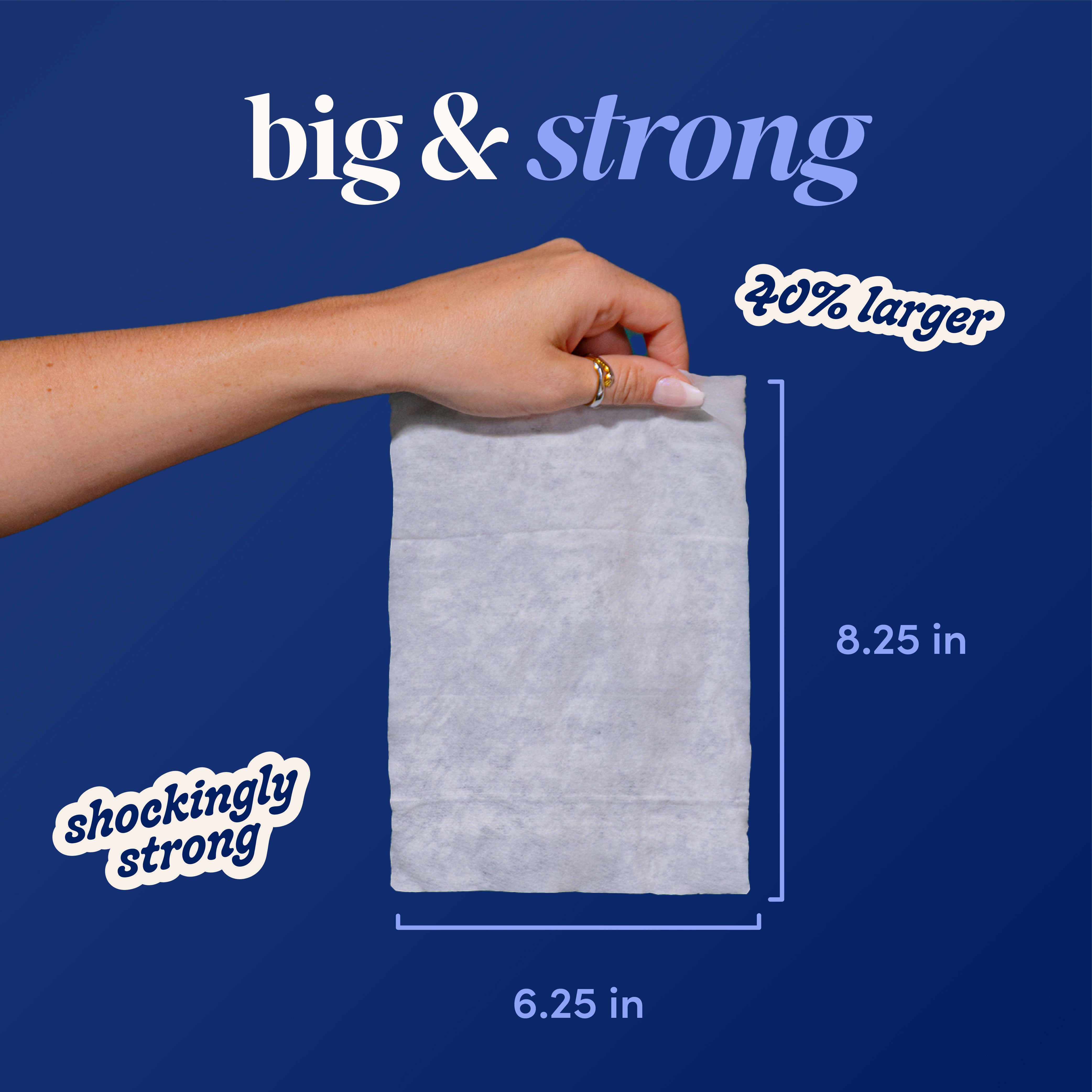 Instead, reach for our perfectly moist, gently cleansing wipes infused with organic aloe and vitamin E. They’re suspiciously soft, surprisingly strong, delightfully soothing, and extra-large to ensure full coverage and supreme foldability (40% larger than your average wipe!).